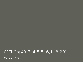 CIELCh 40.714,5.516,118.29 Color is a normal lime color and the nearest color is Chicago #5d5c58. Hex code #5f6158 and RGB value is rgb(95,97,88). In RGB color space, this color is composed of 37% red, 38% green, 35% blue, In CMYK color space, this color is composed of 2% cyan, 0% magenta, 9% yellow , 62% black , In HSL color space, this color has a hue angle of 73° , 5% saturation and 36% lightness.