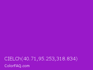 CIELCh 40.71,95.253,318.834 Color is a normal purple color and the nearest color is Dark Orchid #9932cc. Hex code #9919c9 and RGB value is rgb(153,25,201). In RGB color space, this color is composed of 60% red, 10% green, 79% blue, In CMYK color space, this color is composed of 24% cyan, 88% magenta, 0% yellow , 21% black , In HSL color space, this color has a hue angle of 284° , 78% saturation and 44% lightness.