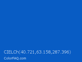 CIELCh 40.721,63.158,287.396 Color is a normal blue color and the nearest color is Science Blue #0066cc. Hex code #085cc4 and RGB value is rgb(8,92,196). In RGB color space, this color is composed of 3% red, 36% green, 77% blue, In CMYK color space, this color is composed of 96% cyan, 53% magenta, 0% yellow , 23% black , In HSL color space, this color has a hue angle of 213° , 92% saturation and 40% lightness.