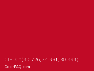CIELCh 40.726,74.931,30.494 Color is a normal red color and the nearest color is Monza #c7031e. Hex code #c10a26 and RGB value is rgb(193,10,38). In RGB color space, this color is composed of 76% red, 4% green, 15% blue, In CMYK color space, this color is composed of 0% cyan, 95% magenta, 80% yellow , 24% black , In HSL color space, this color has a hue angle of 351° , 90% saturation and 40% lightness.