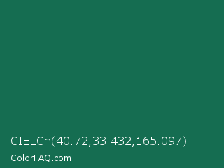 CIELCh 40.72,33.432,165.097 Color is a dark green color and the nearest color is Dark Spring Green #177245. Hex code #156d51 and RGB value is rgb(21,109,81). In RGB color space, this color is composed of 8% red, 43% green, 32% blue, In CMYK color space, this color is composed of 81% cyan, 0% magenta, 26% yellow , 57% black , In HSL color space, this color has a hue angle of 161° , 68% saturation and 25% lightness.