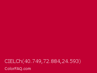 CIELCh 40.749,72.884,24.593 Color is a normal rose color and the nearest color is Red NCS #c40233. Hex code #c20033 and RGB value is rgb(194,0,51). In RGB color space, this color is composed of 76% red, 0% green, 20% blue, In CMYK color space, this color is composed of 0% cyan, 100% magenta, 74% yellow , 24% black , In HSL color space, this color has a hue angle of 344° , 100% saturation and 38% lightness.