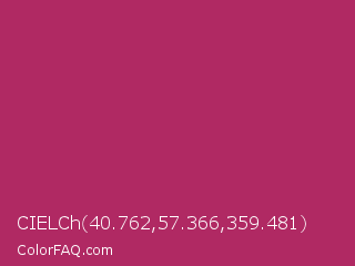 CIELCh 40.762,57.366,359.481 Color is a normal rose color and the nearest color is Rich Maroon #b03060. Hex code #b02963 and RGB value is rgb(176,41,99). In RGB color space, this color is composed of 69% red, 16% green, 39% blue, In CMYK color space, this color is composed of 0% cyan, 77% magenta, 44% yellow , 31% black , In HSL color space, this color has a hue angle of 334° , 62% saturation and 43% lightness.