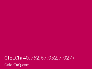 CIELCh 40.762,67.952,7.927 Color is a normal rose color and the nearest color is Pictorial Carmine #c30b4e. Hex code #bf0054 and RGB value is rgb(191,0,84). In RGB color space, this color is composed of 75% red, 0% green, 33% blue, In CMYK color space, this color is composed of 0% cyan, 100% magenta, 56% yellow , 25% black , In HSL color space, this color has a hue angle of 334° , 100% saturation and 37% lightness.