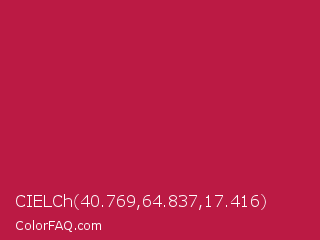 CIELCh 40.769,64.837,17.416 Color is a normal rose color and the nearest color is Maroon Flush #c32148. Hex code #bb1a44 and RGB value is rgb(187,26,68). In RGB color space, this color is composed of 73% red, 10% green, 27% blue, In CMYK color space, this color is composed of 0% cyan, 86% magenta, 64% yellow , 27% black , In HSL color space, this color has a hue angle of 344° , 76% saturation and 42% lightness.