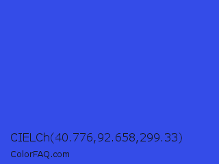 CIELCh 40.776,92.658,299.33 Color is a normal blue color and the nearest color is Palatinate Blue #273be2. Hex code #344ce8 and RGB value is rgb(52,76,232). In RGB color space, this color is composed of 20% red, 30% green, 91% blue, In CMYK color space, this color is composed of 78% cyan, 67% magenta, 0% yellow , 9% black , In HSL color space, this color has a hue angle of 232° , 80% saturation and 56% lightness.