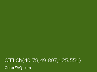 CIELCh 40.78,49.807,125.551 Color is a dark green color and the nearest color is Green Leaf #436a0d. Hex code #426b15 and RGB value is rgb(66,107,21). In RGB color space, this color is composed of 26% red, 42% green, 8% blue, In CMYK color space, this color is composed of 38% cyan, 0% magenta, 80% yellow , 58% black , In HSL color space, this color has a hue angle of 89° , 67% saturation and 25% lightness.