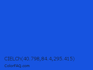 CIELCh 40.798,84.4,295.415 Color is a normal blue color and the nearest color is New Car #214fc6. Hex code #1653e0 and RGB value is rgb(22,83,224). In RGB color space, this color is composed of 9% red, 33% green, 88% blue, In CMYK color space, this color is composed of 90% cyan, 63% magenta, 0% yellow , 12% black , In HSL color space, this color has a hue angle of 222° , 82% saturation and 48% lightness.