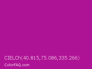 CIELCh 40.815,75.086,335.266 Color is a normal magenta color and the nearest color is Violet Eggplant #991199. Hex code #af1395 and RGB value is rgb(175,19,149). In RGB color space, this color is composed of 69% red, 7% green, 58% blue, In CMYK color space, this color is composed of 0% cyan, 89% magenta, 15% yellow , 31% black , In HSL color space, this color has a hue angle of 310° , 80% saturation and 38% lightness.