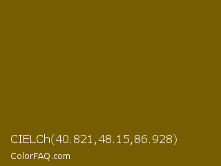 CIELCh 40.821,48.15,86.928 Color is a dark yellow color and the nearest color is Yukon Gold #7b6608. Hex code #775d01 and RGB value is rgb(119,93,1). In RGB color space, this color is composed of 47% red, 36% green, 0% blue, In CMYK color space, this color is composed of 0% cyan, 22% magenta, 99% yellow , 53% black , In HSL color space, this color has a hue angle of 47° , 98% saturation and 24% lightness.