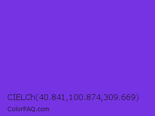 CIELCh 40.841,100.874,309.669 Color is a normal violet color and the nearest color is Blue Violet #8a2be2. Hex code #7633e3 and RGB value is rgb(118,51,227). In RGB color space, this color is composed of 46% red, 20% green, 89% blue, In CMYK color space, this color is composed of 48% cyan, 78% magenta, 0% yellow , 11% black , In HSL color space, this color has a hue angle of 263° , 76% saturation and 55% lightness.