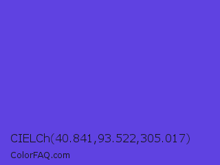 CIELCh 40.841,93.522,305.017 Color is a normal indigo color and the nearest color is Majorelle Blue #6050dc. Hex code #5f42e1 and RGB value is rgb(95,66,225). In RGB color space, this color is composed of 37% red, 26% green, 88% blue, In CMYK color space, this color is composed of 58% cyan, 71% magenta, 0% yellow , 12% black , In HSL color space, this color has a hue angle of 251° , 73% saturation and 57% lightness.