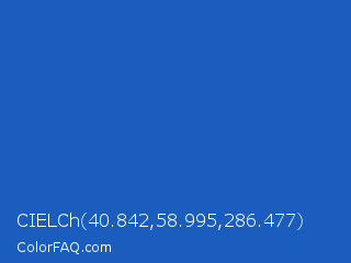 CIELCh 40.842,58.995,286.477 Color is a normal blue color and the nearest color is Denim #1560bd. Hex code #1a5dbe and RGB value is rgb(26,93,190). In RGB color space, this color is composed of 10% red, 36% green, 75% blue, In CMYK color space, this color is composed of 86% cyan, 51% magenta, 0% yellow , 25% black , In HSL color space, this color has a hue angle of 215° , 76% saturation and 42% lightness.