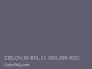 CIELCh 40.851,11.093,299.933 Color is a normal indigo color and the nearest color is Mid Gray #5f5f6e. Hex code #625e70 and RGB value is rgb(98,94,112). In RGB color space, this color is composed of 38% red, 37% green, 44% blue, In CMYK color space, this color is composed of 13% cyan, 16% magenta, 0% yellow , 56% black , In HSL color space, this color has a hue angle of 253° , 9% saturation and 40% lightness.