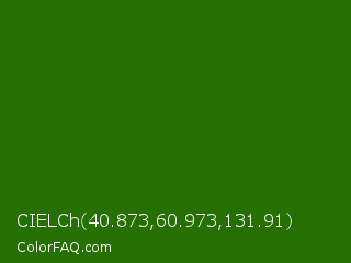CIELCh 40.873,60.973,131.91 Color is a very dark green color and the nearest color is Napier Green #2a8000. Hex code #266f02 and RGB value is rgb(38,111,2). In RGB color space, this color is composed of 15% red, 44% green, 1% blue, In CMYK color space, this color is composed of 66% cyan, 0% magenta, 98% yellow , 56% black , In HSL color space, this color has a hue angle of 100° , 96% saturation and 22% lightness.