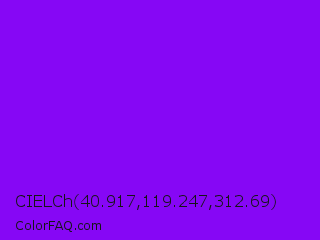 CIELCh 40.917,119.247,312.69 Color is a normal purple color and the nearest color is Electric Violet #8b00ff. Hex code #8607f5 and RGB value is rgb(134,7,245). In RGB color space, this color is composed of 53% red, 3% green, 96% blue, In CMYK color space, this color is composed of 45% cyan, 97% magenta, 0% yellow , 4% black , In HSL color space, this color has a hue angle of 272° , 94% saturation and 49% lightness.