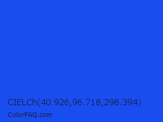 CIELCh 40.926,96.718,298.394 Color is a normal blue color and the nearest color is Palatinate Blue #273be2. Hex code #1a4df0 and RGB value is rgb(26,77,240). In RGB color space, this color is composed of 10% red, 30% green, 94% blue, In CMYK color space, this color is composed of 89% cyan, 68% magenta, 0% yellow , 6% black , In HSL color space, this color has a hue angle of 226° , 88% saturation and 52% lightness.
