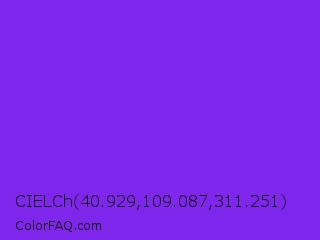 CIELCh 40.929,109.087,311.251 Color is a normal violet color and the nearest color is Blue Violet #8a2be2. Hex code #7e26eb and RGB value is rgb(126,38,235). In RGB color space, this color is composed of 49% red, 15% green, 92% blue, In CMYK color space, this color is composed of 46% cyan, 84% magenta, 0% yellow , 8% black , In HSL color space, this color has a hue angle of 267° , 83% saturation and 54% lightness.
