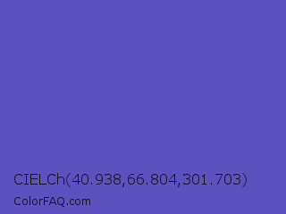 CIELCh 40.938,66.804,301.703 Color is a normal indigo color and the nearest color is Blue Violet #6456b7. Hex code #5d50bf and RGB value is rgb(93,80,191). In RGB color space, this color is composed of 36% red, 31% green, 75% blue, In CMYK color space, this color is composed of 51% cyan, 58% magenta, 0% yellow , 25% black , In HSL color space, this color has a hue angle of 247° , 46% saturation and 53% lightness.