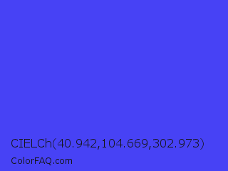 CIELCh 40.942,104.669,302.973 Color is a light indigo color and the nearest color is Ultramarine Blue #4166f5. Hex code #4742f5 and RGB value is rgb(71,66,245). In RGB color space, this color is composed of 28% red, 26% green, 96% blue, In CMYK color space, this color is composed of 71% cyan, 73% magenta, 0% yellow , 4% black , In HSL color space, this color has a hue angle of 242° , 90% saturation and 61% lightness.