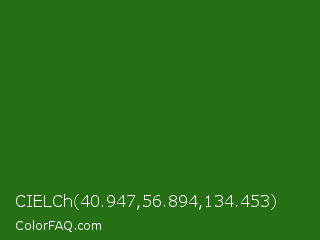 CIELCh 40.947,56.894,134.453 Color is a dark green color and the nearest color is Bilbao #327c14. Hex code #266f14 and RGB value is rgb(38,111,20). In RGB color space, this color is composed of 15% red, 44% green, 8% blue, In CMYK color space, this color is composed of 66% cyan, 0% magenta, 82% yellow , 56% black , In HSL color space, this color has a hue angle of 108° , 69% saturation and 26% lightness.