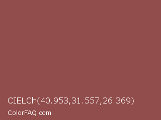 CIELCh 40.953,31.557,26.369 Color is a normal red color and the nearest color is Copper Rust #944747. Hex code #914d4b and RGB value is rgb(145,77,75). In RGB color space, this color is composed of 57% red, 30% green, 29% blue, In CMYK color space, this color is composed of 0% cyan, 47% magenta, 48% yellow , 43% black , In HSL color space, this color has a hue angle of 2° , 32% saturation and 43% lightness.