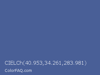 CIELCh 40.953,34.261,283.981 Color is a normal blue color and the nearest color is Queen Blue #436b95. Hex code #495f97 and RGB value is rgb(73,95,151). In RGB color space, this color is composed of 29% red, 37% green, 59% blue, In CMYK color space, this color is composed of 52% cyan, 37% magenta, 0% yellow , 41% black , In HSL color space, this color has a hue angle of 223° , 35% saturation and 44% lightness.