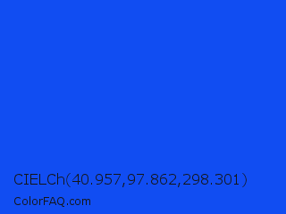 CIELCh 40.957,97.862,298.301 Color is a normal blue color and the nearest color is Blue RYB #0247fe. Hex code #114df2 and RGB value is rgb(17,77,242). In RGB color space, this color is composed of 7% red, 30% green, 95% blue, In CMYK color space, this color is composed of 93% cyan, 68% magenta, 0% yellow , 5% black , In HSL color space, this color has a hue angle of 224° , 90% saturation and 51% lightness.