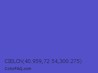 CIELCh 40.959,72.54,300.275 Color is a normal indigo color and the nearest color is Iris #5a4fcf. Hex code #5450c9 and RGB value is rgb(84,80,201). In RGB color space, this color is composed of 33% red, 31% green, 79% blue, In CMYK color space, this color is composed of 58% cyan, 60% magenta, 0% yellow , 21% black , In HSL color space, this color has a hue angle of 242° , 53% saturation and 55% lightness.