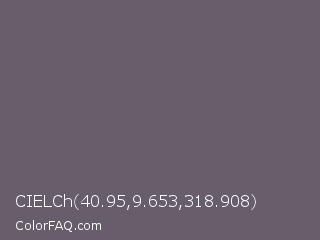 CIELCh 40.95,9.653,318.908 Color is a normal purple color and the nearest color is Salt Box #685e6e. Hex code #685d6b and RGB value is rgb(104,93,107). In RGB color space, this color is composed of 41% red, 36% green, 42% blue, In CMYK color space, this color is composed of 3% cyan, 13% magenta, 0% yellow , 58% black , In HSL color space, this color has a hue angle of 287° , 7% saturation and 39% lightness.