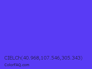 CIELCh 40.968,107.546,305.343 Color is a normal indigo color and the nearest color is Majorelle Blue #6050dc. Hex code #593bf5 and RGB value is rgb(89,59,245). In RGB color space, this color is composed of 35% red, 23% green, 96% blue, In CMYK color space, this color is composed of 64% cyan, 76% magenta, 0% yellow , 4% black , In HSL color space, this color has a hue angle of 250° , 90% saturation and 60% lightness.
