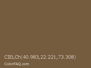 CIELCh 40.983,22.221,73.308 Color is a normal orange color and the nearest color is Tobacco Brown #715d47. Hex code #765c3e and RGB value is rgb(118,92,62). In RGB color space, this color is composed of 46% red, 36% green, 24% blue, In CMYK color space, this color is composed of 0% cyan, 22% magenta, 47% yellow , 54% black , In HSL color space, this color has a hue angle of 32° , 31% saturation and 35% lightness.