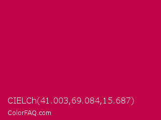 CIELCh 41.003,69.084,15.687 Color is a normal rose color and the nearest color is Pictorial Carmine #c30b4e. Hex code #c10446 and RGB value is rgb(193,4,70). In RGB color space, this color is composed of 76% red, 2% green, 27% blue, In CMYK color space, this color is composed of 0% cyan, 98% magenta, 64% yellow , 24% black , In HSL color space, this color has a hue angle of 339° , 96% saturation and 39% lightness.