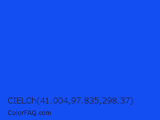 CIELCh 41.004,97.835,298.37 Color is a normal blue color and the nearest color is Blue RYB #0247fe. Hex code #144df2 and RGB value is rgb(20,77,242). In RGB color space, this color is composed of 8% red, 30% green, 95% blue, In CMYK color space, this color is composed of 92% cyan, 68% magenta, 0% yellow , 5% black , In HSL color space, this color has a hue angle of 225° , 90% saturation and 51% lightness.