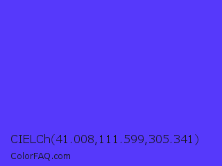 CIELCh 41.008,111.599,305.341 Color is a normal indigo color and the nearest color is Han Purple #5218fa. Hex code #5639fb and RGB value is rgb(86,57,251). In RGB color space, this color is composed of 34% red, 22% green, 98% blue, In CMYK color space, this color is composed of 66% cyan, 77% magenta, 0% yellow , 2% black , In HSL color space, this color has a hue angle of 249° , 96% saturation and 60% lightness.
