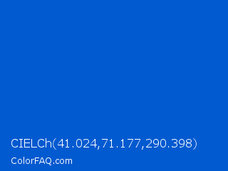 CIELCh 41.024,71.177,290.398 Color is a normal blue color and the nearest color is Science Blue #0066cc. Hex code #025ad0 and RGB value is rgb(2,90,208). In RGB color space, this color is composed of 1% red, 35% green, 82% blue, In CMYK color space, this color is composed of 99% cyan, 57% magenta, 0% yellow , 18% black , In HSL color space, this color has a hue angle of 214° , 98% saturation and 41% lightness.