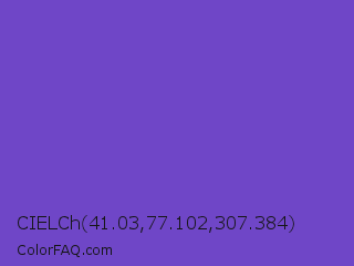 CIELCh 41.03,77.102,307.384 Color is a normal indigo color and the nearest color is Studio #714ab2. Hex code #6f46c7 and RGB value is rgb(111,70,199). In RGB color space, this color is composed of 44% red, 27% green, 78% blue, In CMYK color space, this color is composed of 44% cyan, 65% magenta, 0% yellow , 22% black , In HSL color space, this color has a hue angle of 259° , 54% saturation and 53% lightness.