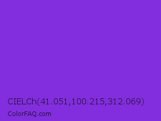 CIELCh 41.051,100.215,312.069 Color is a normal violet color and the nearest color is Blue Violet #8a2be2. Hex code #822dde and RGB value is rgb(130,45,222). In RGB color space, this color is composed of 51% red, 18% green, 87% blue, In CMYK color space, this color is composed of 41% cyan, 80% magenta, 0% yellow , 13% black , In HSL color space, this color has a hue angle of 269° , 73% saturation and 52% lightness.