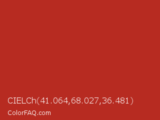 CIELCh 41.064,68.027,36.481 Color is a normal red color and the nearest color is Tall Poppy #b32d29. Hex code #b72b21 and RGB value is rgb(183,43,33). In RGB color space, this color is composed of 72% red, 17% green, 13% blue, In CMYK color space, this color is composed of 0% cyan, 77% magenta, 82% yellow , 28% black , In HSL color space, this color has a hue angle of 4° , 69% saturation and 42% lightness.