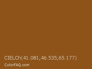CIELCh 41.081,46.535,65.177 Color is a normal orange color and the nearest color is Grizzly #885818. Hex code #8d5318 and RGB value is rgb(141,83,24). In RGB color space, this color is composed of 55% red, 33% green, 9% blue, In CMYK color space, this color is composed of 0% cyan, 41% magenta, 83% yellow , 45% black , In HSL color space, this color has a hue angle of 30° , 71% saturation and 32% lightness.