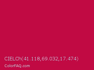 CIELCh 41.118,69.032,17.474 Color is a normal rose color and the nearest color is Pictorial Carmine #c30b4e. Hex code #c10943 and RGB value is rgb(193,9,67). In RGB color space, this color is composed of 76% red, 4% green, 26% blue, In CMYK color space, this color is composed of 0% cyan, 95% magenta, 65% yellow , 24% black , In HSL color space, this color has a hue angle of 341° , 91% saturation and 40% lightness.