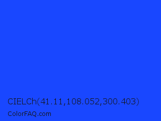 CIELCh 41.11,108.052,300.403 Color is a normal blue color and the nearest color is Blue RYB #0247fe. Hex code #1947ff and RGB value is rgb(25,71,255). In RGB color space, this color is composed of 10% red, 28% green, 100% blue, In CMYK color space, this color is composed of 90% cyan, 72% magenta, 0% yellow , 0% black , In HSL color space, this color has a hue angle of 228° , 100% saturation and 55% lightness.