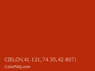 CIELCh 41.121,74.35,42.807 Color is a normal red color and the nearest color is Thunderbird #c02b18. Hex code #b82b0a and RGB value is rgb(184,43,10). In RGB color space, this color is composed of 72% red, 17% green, 4% blue, In CMYK color space, this color is composed of 0% cyan, 77% magenta, 95% yellow , 28% black , In HSL color space, this color has a hue angle of 11° , 90% saturation and 38% lightness.