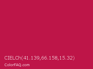 CIELCh 41.139,66.158,15.32 Color is a normal rose color and the nearest color is Pictorial Carmine #c30b4e. Hex code #be1548 and RGB value is rgb(190,21,72). In RGB color space, this color is composed of 75% red, 8% green, 28% blue, In CMYK color space, this color is composed of 0% cyan, 89% magenta, 62% yellow , 25% black , In HSL color space, this color has a hue angle of 342° , 80% saturation and 41% lightness.