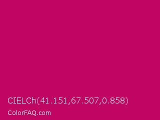 CIELCh 41.151,67.507,0.858 Color is a normal rose color and the nearest color is Lipstick #ab0563. Hex code #be0662 and RGB value is rgb(190,6,98). In RGB color space, this color is composed of 75% red, 2% green, 38% blue, In CMYK color space, this color is composed of 0% cyan, 97% magenta, 48% yellow , 25% black , In HSL color space, this color has a hue angle of 330° , 94% saturation and 38% lightness.