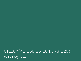 CIELCh 41.158,25.204,178.126 Color is a dark cyan color and the nearest color is Casal #2f6168. Hex code #266c5f and RGB value is rgb(38,108,95). In RGB color space, this color is composed of 15% red, 42% green, 37% blue, In CMYK color space, this color is composed of 65% cyan, 0% magenta, 12% yellow , 58% black , In HSL color space, this color has a hue angle of 169° , 48% saturation and 29% lightness.
