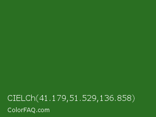 CIELCh 41.179,51.529,136.858 Color is a dark green color and the nearest color is Bilbao #327c14. Hex code #2a6f22 and RGB value is rgb(42,111,34). In RGB color space, this color is composed of 16% red, 44% green, 13% blue, In CMYK color space, this color is composed of 62% cyan, 0% magenta, 69% yellow , 56% black , In HSL color space, this color has a hue angle of 114° , 53% saturation and 28% lightness.