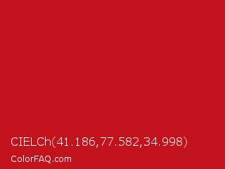 CIELCh 41.186,77.582,34.998 Color is a normal red color and the nearest color is Venetian Red #c80815. Hex code #c2121b and RGB value is rgb(194,18,27). In RGB color space, this color is composed of 76% red, 7% green, 11% blue, In CMYK color space, this color is composed of 0% cyan, 91% magenta, 86% yellow , 24% black , In HSL color space, this color has a hue angle of 357° , 83% saturation and 42% lightness.
