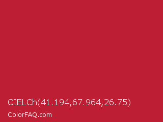 CIELCh 41.194,67.964,26.75 Color is a normal red color and the nearest color is Cardinal #c41e3a. Hex code #bd1e33 and RGB value is rgb(189,30,51). In RGB color space, this color is composed of 74% red, 12% green, 20% blue, In CMYK color space, this color is composed of 0% cyan, 84% magenta, 73% yellow , 26% black , In HSL color space, this color has a hue angle of 352° , 73% saturation and 43% lightness.