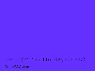 CIELCh 41.195,116.709,307.227 Color is a normal indigo color and the nearest color is Han Purple #5218fa. Hex code #6330ff and RGB value is rgb(99,48,255). In RGB color space, this color is composed of 39% red, 19% green, 100% blue, In CMYK color space, this color is composed of 61% cyan, 81% magenta, 0% yellow , 0% black , In HSL color space, this color has a hue angle of 255° , 100% saturation and 59% lightness.